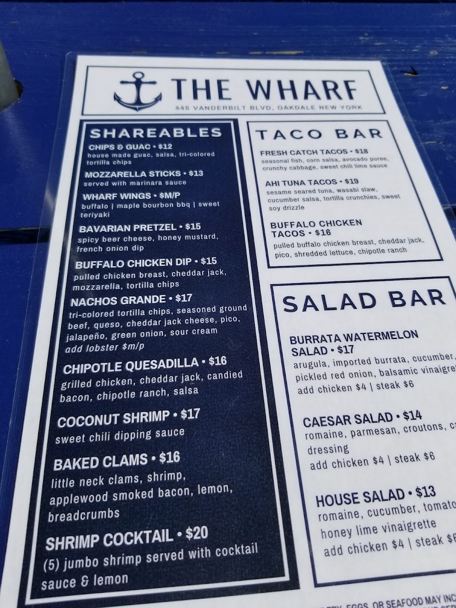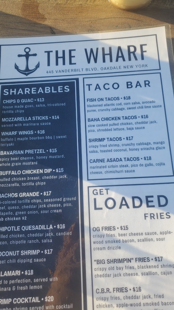 Welcome to The Wharf, a culinary gem nestled at 445 Vanderbilt Blvd, Oakdale, NY. This vibrant eatery shines with a diverse menu, perfect for casual dining enthusiasts. Indulge in shareable appetizers like the Buffalo Chicken Dip or creamy Chips & Guac, each bursting with flavor.